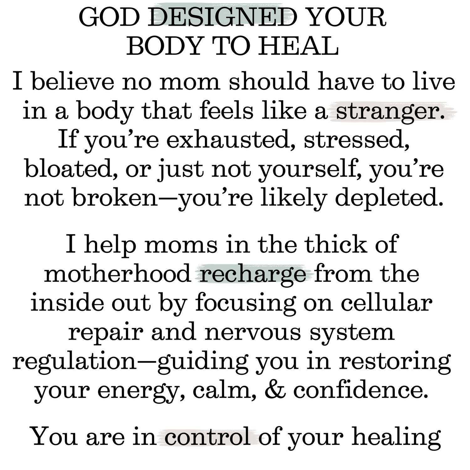 I believe God designed your body with wisdom, intention, and rhythm—and when it’s supported at the root, it can heal. I’m here to help moms who feel dismissed and depleted finally understand why they feel the way they do—and show them the way back to vibrant energy, emotional calm, balanced hormones, and peace in their own skin.